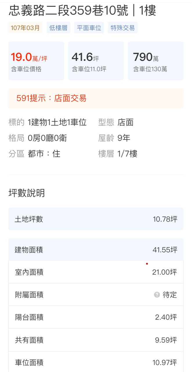 本人同意並願意遵守現行法律、本站使用者條款、本站各級規定、本板所有規範, 本人願意為本文內容負責,並保証本文內容皆詳盡屬實,若違反相關規範,願受處分。 本文僅授權發表於PTT實業坊,未經同意不得轉載至其它網站,否則得視情況提出告訴。 建物門牌: 桃園市 龜山區 忠義路二段 (最小單位應填至巷/弄) 房屋屋齡: 9年 (填整數,預售屋以「零」表示) 房屋類型: 大樓 (擇一,得依實際情形自行填入其它項目) 所在樓層: 本案在 1樓/共 7樓 (獨棟類僅需填寫總樓層數) 房屋坪數 (以下六項應四捨五入至精確度小數點後一位以上) 建物權狀: 41.55坪 (應為以下四項數值之和) 主建物 : 18.59坪 (應填室內坪數) 附屬建物: 2.4坪 (應填陽台、露台等坪數) 共同使用: 9.58坪 (應填公共設施坪數) 車位  : 10.97坪 (車位併入共同使用項者應於此項註明之) 建物權狀是否包含車位坪數:Y (選是或否) 土地權狀: 10.78坪 (若無土地權狀坪數者,應於此項詳述事由) 格局  : 開放式格局(日用品零售業) (填整數) 開價  : 1380萬元 (填整數,應填總價) 停車位 : 坡道平面 (擇一) 交通  : 忠義路二段、復興一路 (應填兩個以上鄰近本物件之路名) 本物件附近地址實價登錄 : (依開頭說明文字查詢之) https://imgur.com/Ky8pmmP 本物件兩年內上一筆實價登錄: (若有則不得併入前項)應以內政部實價登錄網站為準,得以文字截圖表示之, 查不到或沒有應填「無」、「沒有」、「查無資料」。 房屋仲介本項目填寫不全或不實者水桶一年以上並退文。 照片連結(僅得有本物件之截圖) https://imgur.com/OoCvoiC https://imgur.com/Y4D5gri https://imgur.com/F9J43Vq 其他介紹: 比住宅便宜的一樓店面 超大平面車位 謄本是日用品零售業 *在社區巷子內當然不會有人流 如果你需要的是個人工作室 網拍團購倉庫 自營公司使用 但買不起動不動兩千起跳的店面或是一千五以上的電梯事務所 來看這間! 如果實價哥有推文 成交抽十杯星巴克給推文(不重複計算推文 如果覺得現在是高點,我用力幫你砍回低點價 早上才PO的591開價1450,下午就接到降價通知1380 懂的就懂什麼意思,用得上不要管開價來約看~~~速度~~~ 聯絡資訊:站內信/LINE:lasoon/0953647980 (擇一以上,並得加上通訊軟體ID) 聯絡資訊應含有聯絡人姓氏及上開其中一種以上聯絡方式, 違者處水桶十四日並刪除文章。 銷售來源:房屋仲介 (擇一) 代PO者應填屋主本人之聯絡資訊, 代理人不得收取任何費用, 僅房屋仲介應填下列六項資訊,屋主本人和代理人不填。 房屋仲介下列資訊填寫不全或不實者水桶一年以上並退文。 台灣房屋-扶輪特區加盟店(燊昌不動產股份有限公司) (應填全名) 公司地址 :新北市林口區文化二路一段256號 公司電話 :02-26082288 經紀人姓名:陳志強(109)003762 (應填全名與證號) 營業員姓名:王宗斌(109)363877 (應填全名與證號,若經紀人營業員為同一人應註明之) 收費方式 :2 % (賣方不得超過4%、買方不得超過2%、代理人不得填寫此項) -- ※ 發信站: 批踢踢實業坊(www.ptt.org.tw), 來自: 125.229.111.90 (臺灣) ※ 文章網址: https://www.ptt.org.tw/home-sale/M.1744357927.A.2BF