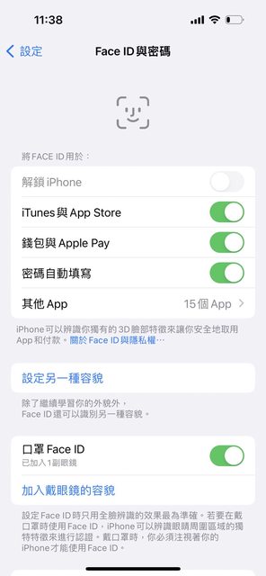 機型名稱:iphone 14pro 128g 問題描述: 前幾個禮拜買了14pro,用了幾個禮拜才發現FaceID無法解鎖都只能打密碼,但下載app又可以 FACEID解鎖,近設定看才發現解鎖iphone這個選項變灰色的,完全無法開啟,還有一些其他 的功能也是,網路上完全查不到相關的資料,大部分都是FACEID壞掉的資訊,想問看看板上 的大大有沒有遇到這種情況過。 https://i.imgur.com/XZGVvOX.jpg