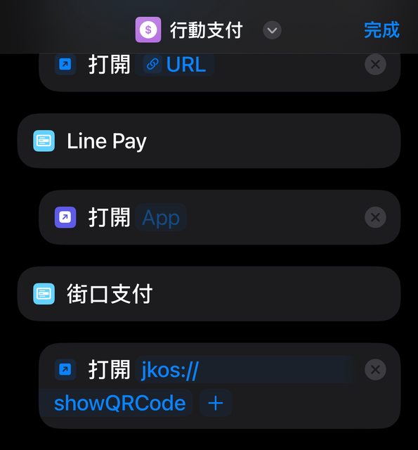 「打開 App」 換成「開啟 URL 」並填上「jkos://showQRCode」就可以了