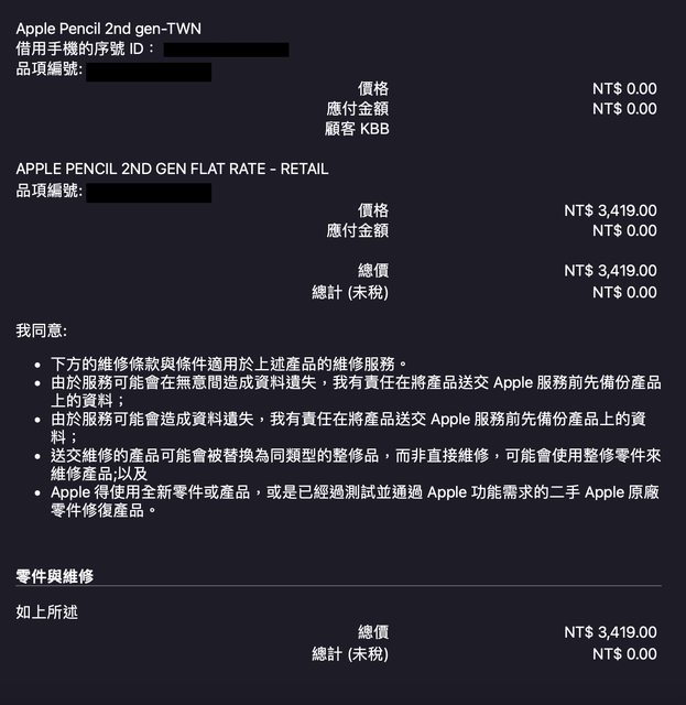 今天打電話向客服說明要附加配件,報完 iPad 和 Apple Pencil 序號後