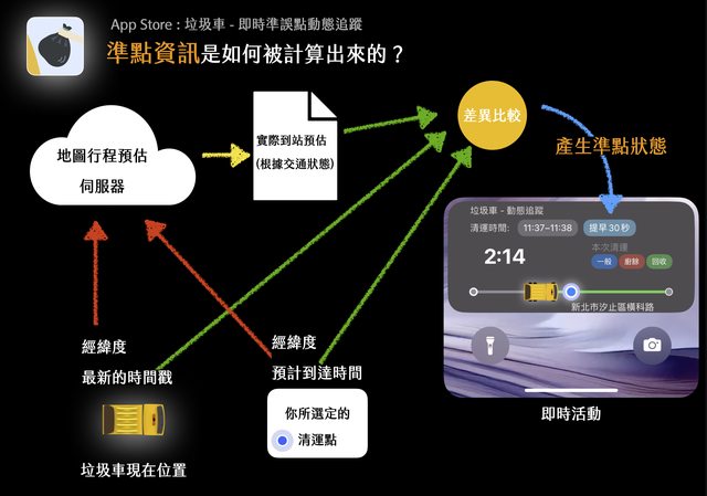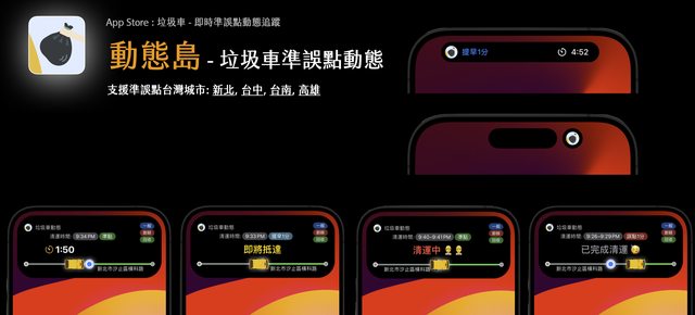 即時活動結合動態島,加上垃圾車自動追蹤功能,透過獨家演算法,提供垃圾車準點資訊