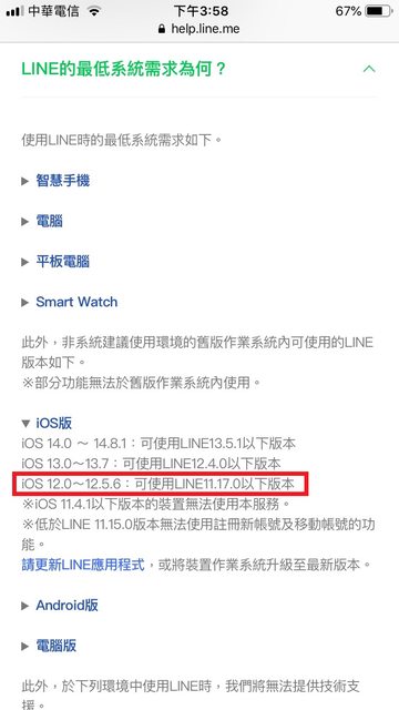 我手機iPhone6(32GB 2017年生產的) iOS只能升級到iOS 12.5.7 因為之前一直停留在iOS 11 所以LINE停留在10.17.0 雖然後來有升到iOS 12 但LINE已經要iOS 15以上才能裝新版的LINE LINE今年11/1起不支援11.15.0以下的版本 https://i.imgur.com/zrGxlyU.jpg
