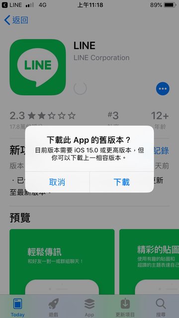 mobile028: LINE系統己經告訴你這要iOS15以上才能裝新版的LINE 12/10 19:42