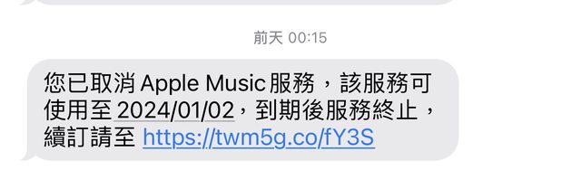 12/12凌晨傻眼進線給台灣大哥大客服 客服表示會再幫我向上呈報 在電話結束之後 收到台灣大哥大的簡訊 表示Apple music已取消 https://i.imgur.com/LgtFqTj.jpg