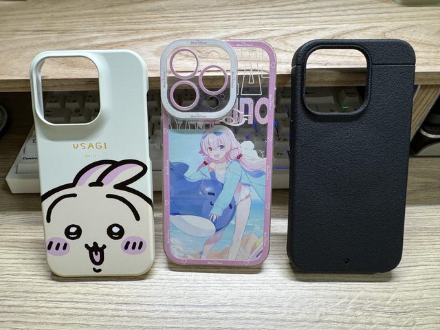 : 從左到右是韓國買的吉伊卡哇殼、淘寶買的蔚藍檔案殼、Caudabe SHEATH