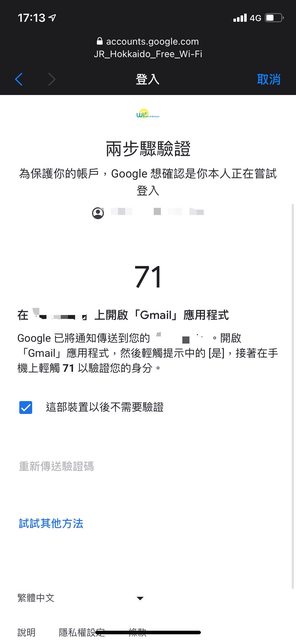 然後就登入google,一路來到兩步驗證的畫面