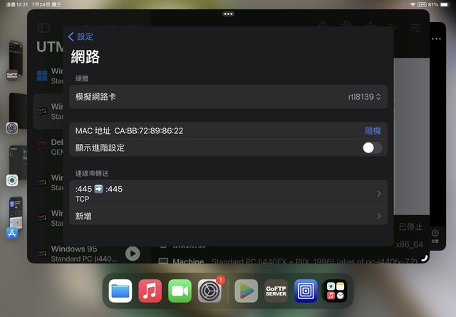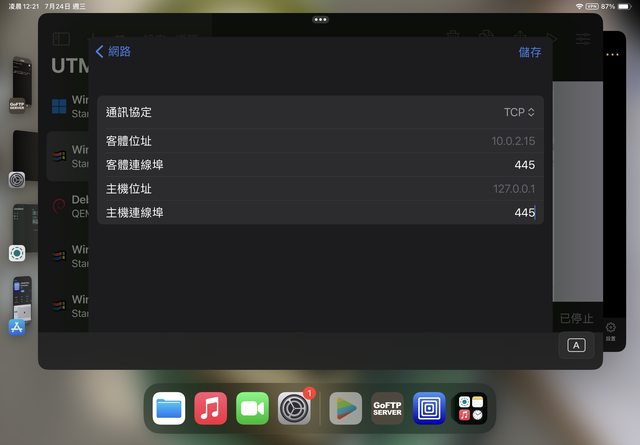 (1) 虛擬機開啟 SMB 協定:設定轉送連接埠 445,iPad 端連上 127.0.0.1:445