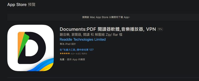 類似軟體如:Documents:PDF 閱讀器軟體,音樂播放器, VPN