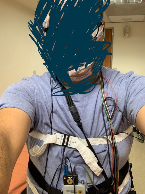 : : 臉上貼的亂七八糟+身上戴一堆儀器,肩膀還要背一台儀器,重點還不能玩手機,