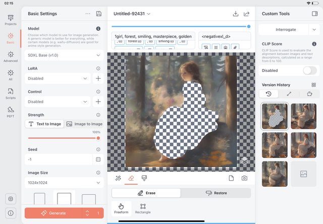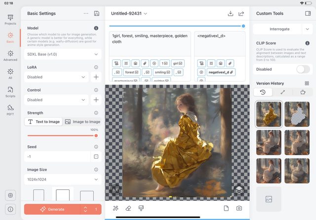 然後填入正負提示詞,解析度設1024x1024,點選生成,boom,圖片就出來了。