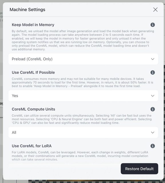 首先要在APP設定開啟CoreML全部加速器,加快生圖速度。