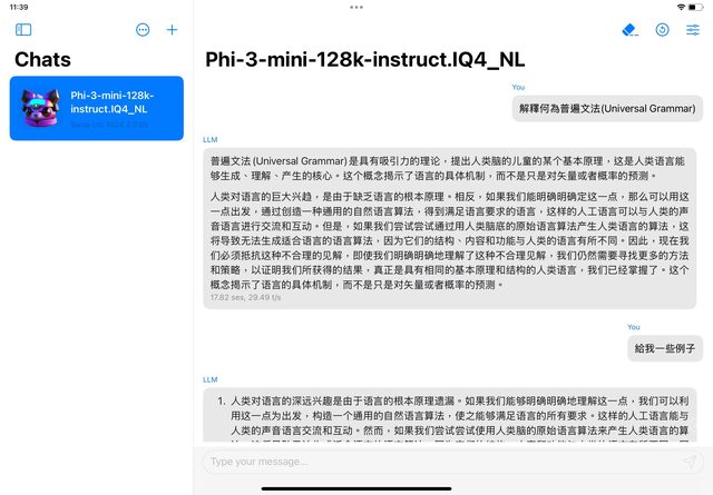 iPad跑語言模型。CPU硬算的情況下跑3B的小模型其實速度還滿快的。