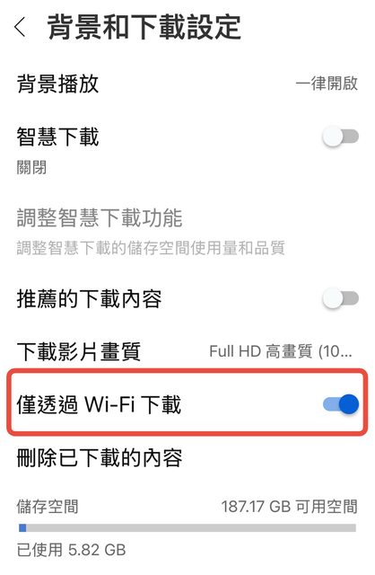 設定開啟 "僅透過 Wi-Fi 下載"