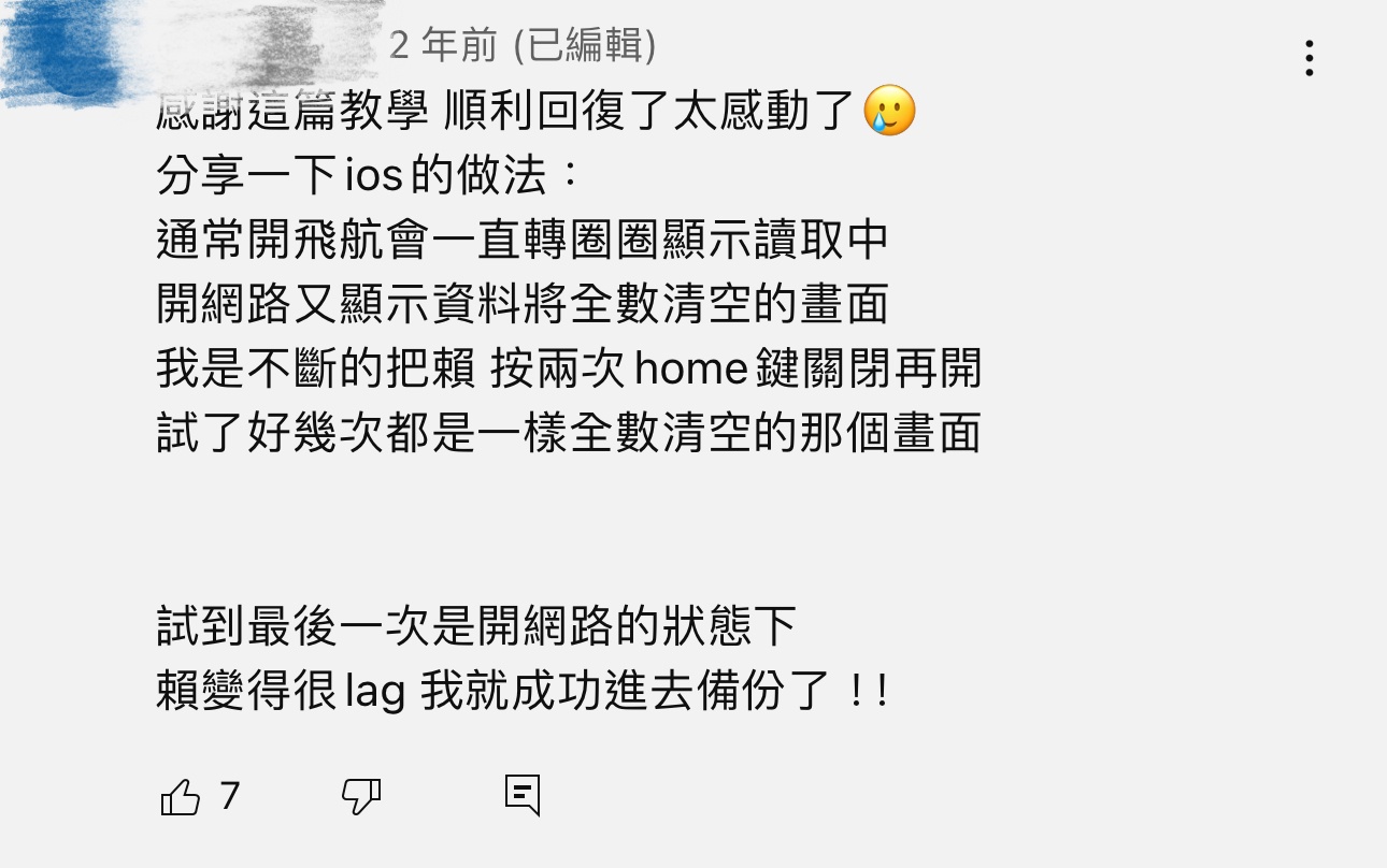 → toymonster: 他裝置導致對話紀錄不見,後來用這個方法成功回去備份 11/12 12:27