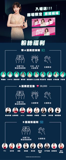 典禮時間:2023/08/02 (三) 19:30 入場時間:2023/08/02 (三) 18:00 星光大道:2023/08/02 (三) 17:30 (依現場實際情況而定) 典禮地點:TICC台北國際會議中心 典禮地址:台北市信義區信義路五段1號 座位票價: 特A區 AV+觀看券6900禮包(限量100組) ・購票時將提供您對應的座位號碼,入場時依據座位號碼入座 ・座位號碼將依據購買順序進行發放 A區 30000紅鑽 ・採自由入座 B區 AV+ VIP訂閱 ・採自由入座 ・僅開放付費VIP,推廣計畫的免費VIP不適用 主辦單位:AV+ 粉絲福利: https://i.imgur.com/AWi7g5S.png