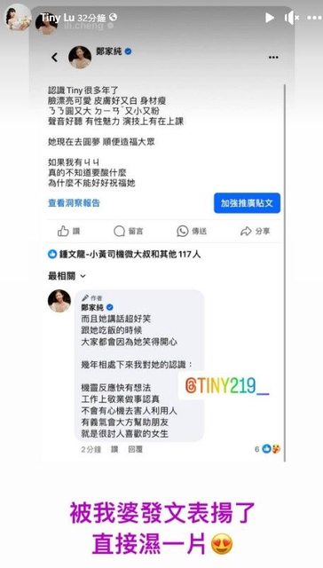 此外,田井虹也轉發鄭家純的文章說,「被我婆發文表揚了,直接濕一片」。
