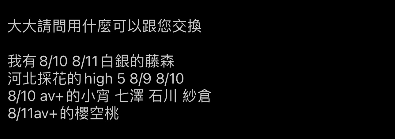 → MILKTEALOVE: 8/10號 新有菜 換河北任何一天場次 07/27 17:58
