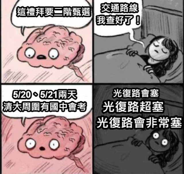 噓 waiting101: 因為據說今年研究所筆試新竹大雨清大塞翻天缺考一堆 05/20 12:34