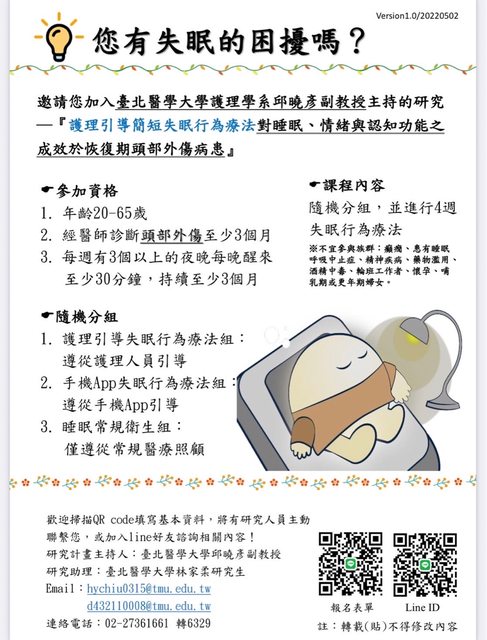 我們是台北醫學大學護理學院的博士研究生,目前正在招募受試者進行中文版簡短版失眠