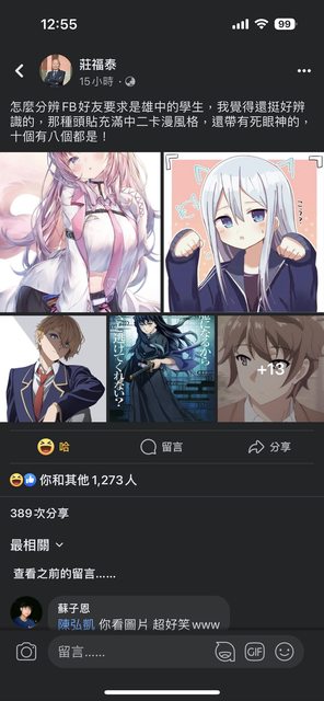 怎麼分辨FB好友要求是雄中的學生,我覺得還挺好辨識的,那種頭貼充滿中二卡漫風格,還帶有死眼神的,十個有八個都是!