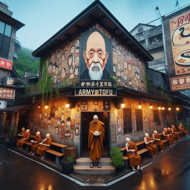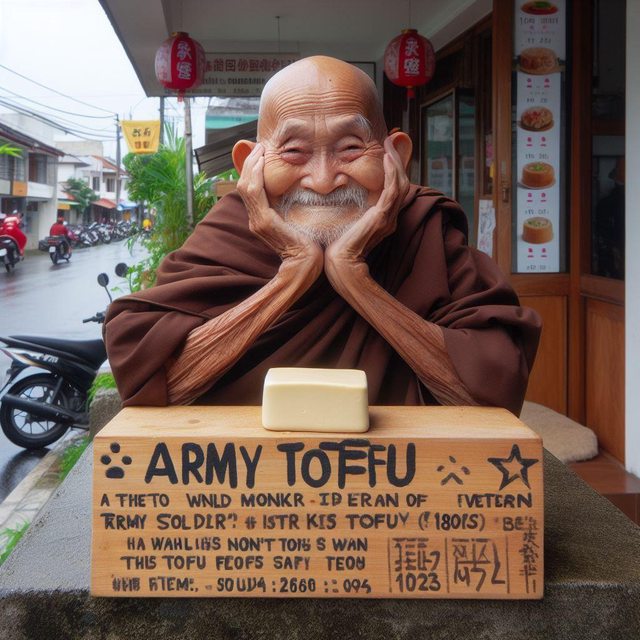 有一個和尚到市區裡辦公,路過一間退伍老兵開的豆腐店突然感動不已,他讚嘆:佛果然無所不在。