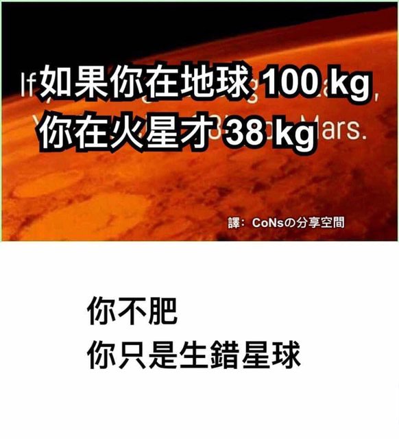 噓 Elgnairt: 你生在地球100kg,生在火星也是100kg,只是量測出來是38 05/30 11:28