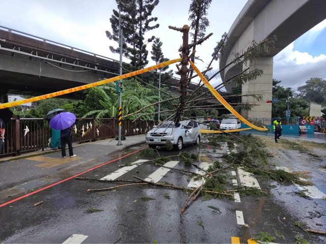 今(7)日12時左右,土城區中央路四段、福田路口有路樹倒塌壓到車輛情事,員警立即