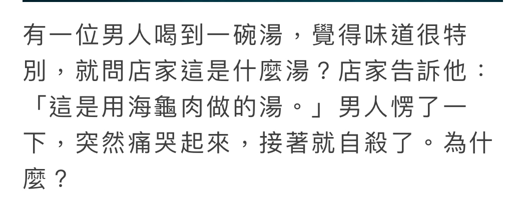 推 dogday : 他第一次拿海龜湯問我我直接說答案時還嚇到,我說 10/27 15:55