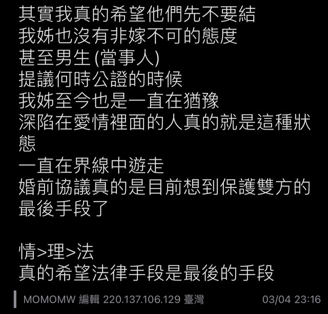 : : likangrace : 婚前協議又不是免死金牌,那要雙方都接受才簽得了耶 03/04 23:0