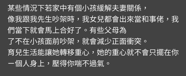 : 育兒生活能讓她轉移重心,她的重心就不會只擺在你ㄧ個人身上,壓得你喘不過氣。
