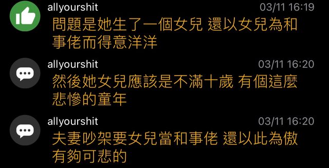 : 噓 greensh: 夫妻吵架要小孩當和事佬? 這麼離譜的事你還能得意 3/09 19:22