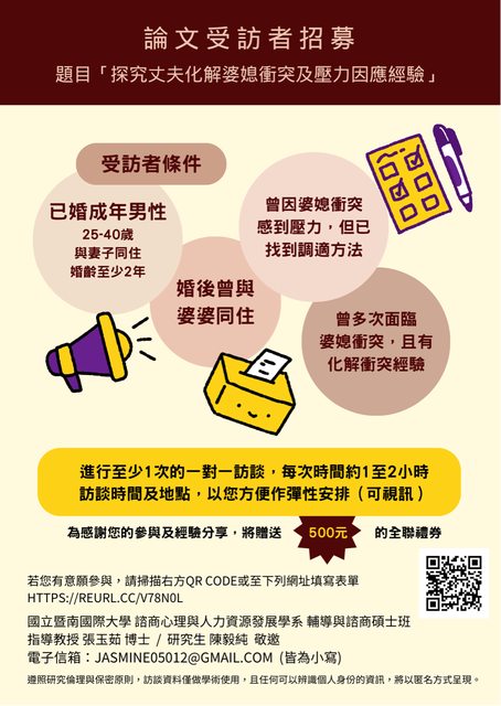 我的論文題目為「探究丈夫化解婆媳衝突及壓力因應經驗」,研究目的為瞭解丈夫轉化婆