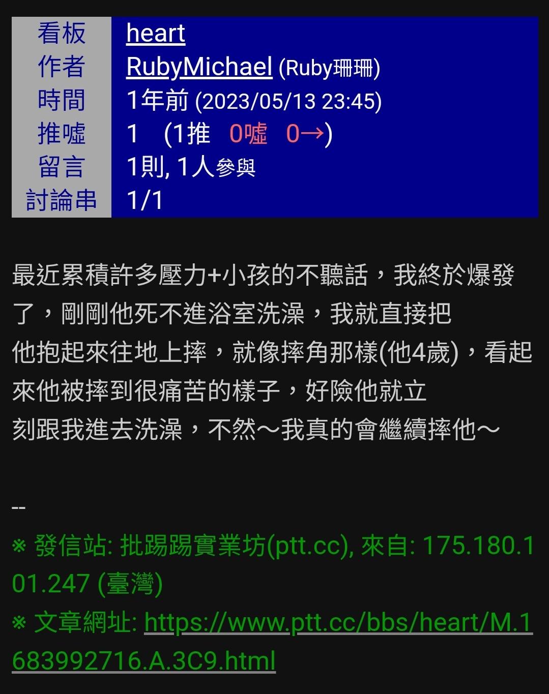 → RubyMichael : 他知道我摔小孩的事情,可以不要把這篇文跟之前的文 05/10 14:53