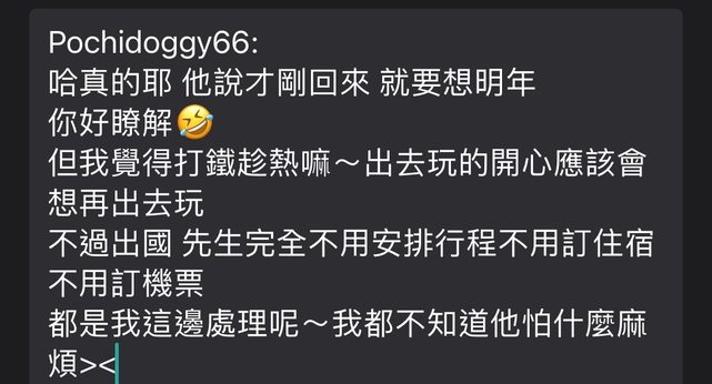 : → ginny157 : 可以接受先生不愛出去玩呀 但不能阻止我出國吧 05/21 12: