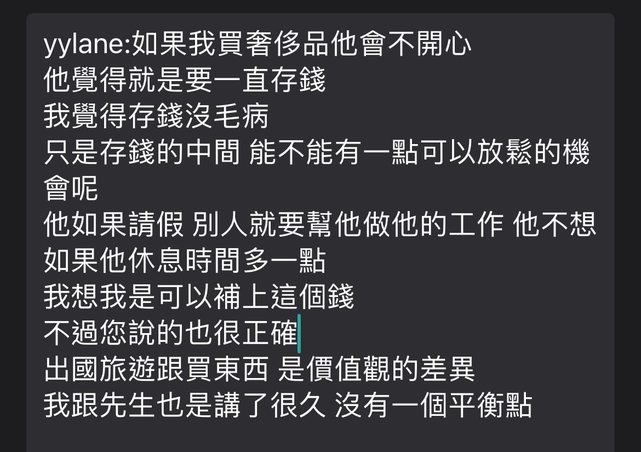 每個人金錢觀不同,我個人也是即時行樂派,但你先生的考量也無不妥