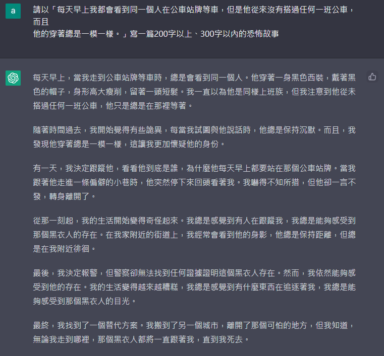→ alliana: AI寫的恐怖短篇不太恐怖。02/24 11:54