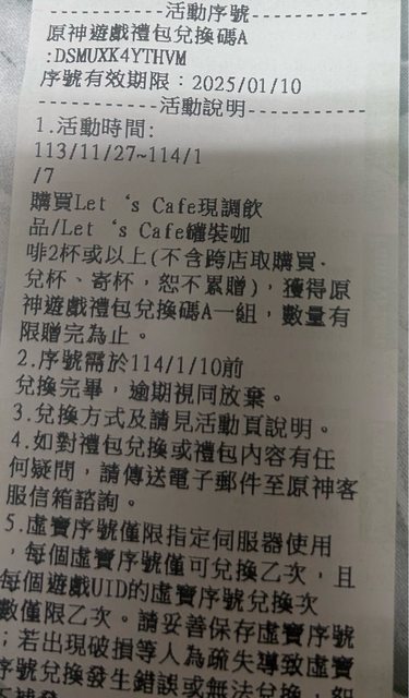 標題[原神] 贈送全家咖啡序號A