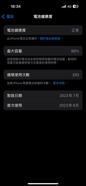 物品狀況:電池健康度98,循環次數293,已裝保護殼貼,外觀無傷無送修紀錄,TYPE C