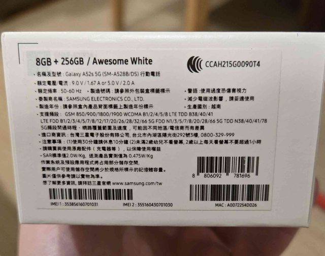 欲售物品:SAMSUNG A52s 白色 8G/256G