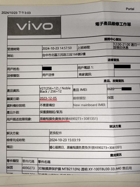 保固日期:2024/12/05 昨天回原廠換膜時單據如下