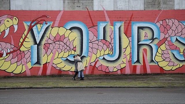 牆壁的塗鴉 是條纏繞的蛇 背景的文字 鏡頭則有意無意地裁了大大的YOURS