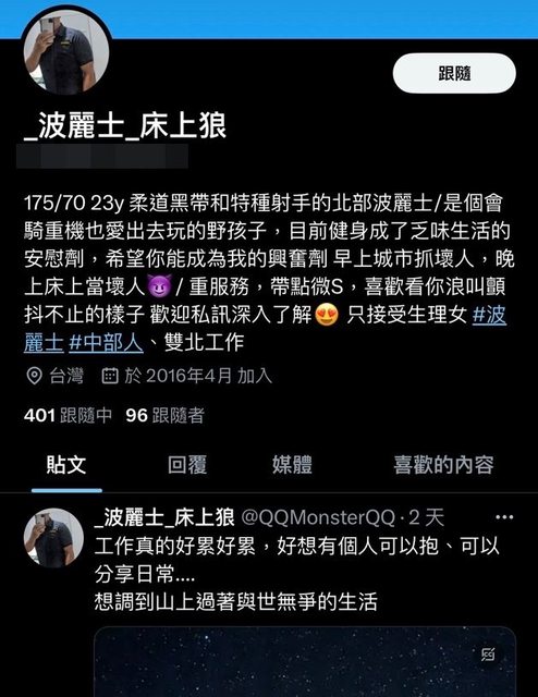 該名員警爭議貼文不只一樁,他在社群平台暱稱「波麗士-床上狼」,以穿著警察制服的