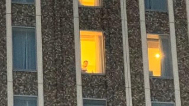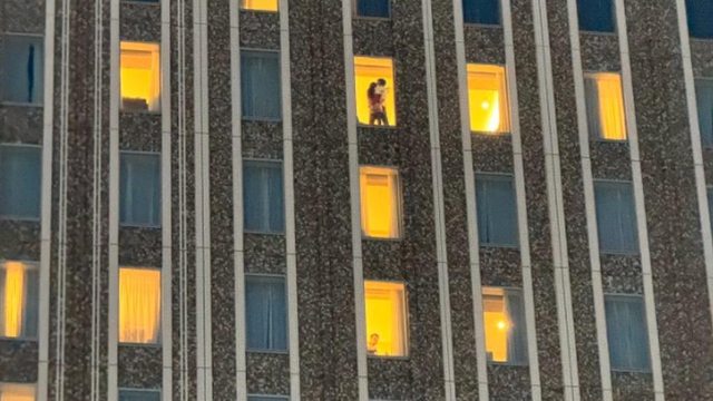 男伴在會場對面的飯店忘情激吻,全然忘記身後的落地窗已經無情出賣自己。
