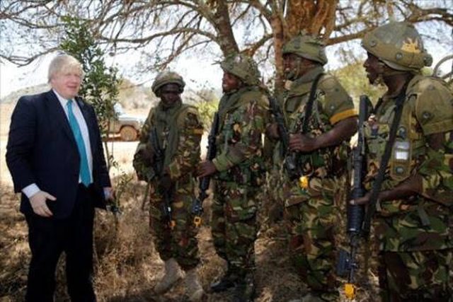 2017年3月17日,時任英國外交大臣強生(左)在亞北部的奧萊奈舒(Ole Naish),視察英