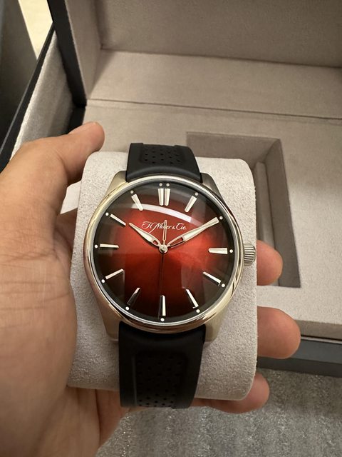 亨利幕時 紅色漸層面盤非常吸睛,配上膠帶,是一隻高調的休閒錶款