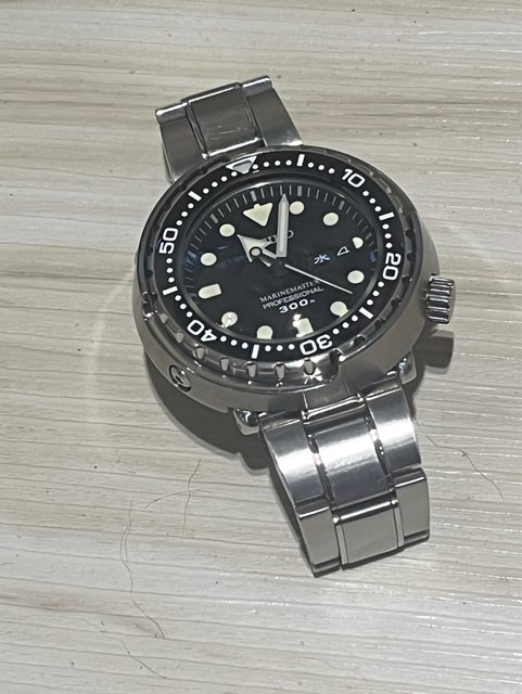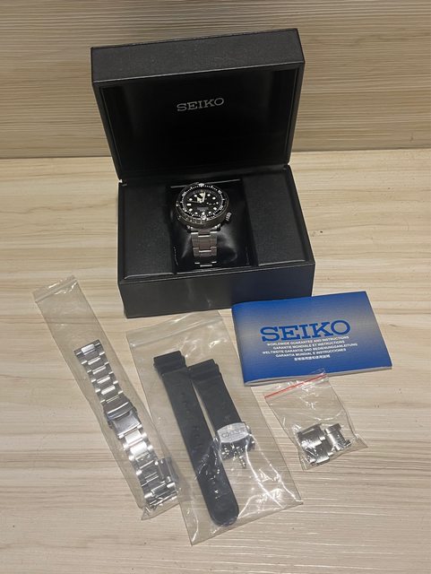 經典停產款石英鮪魚罐頭SBBN031、保卡、錶盒、錶節購買收據大全套。錶帶些許使用細