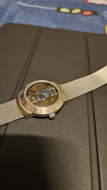 鍊機械錶,正面鏤空搭配偏光鏡使其表面有乎明忽暗的變化,秒針時分針都有特殊造型