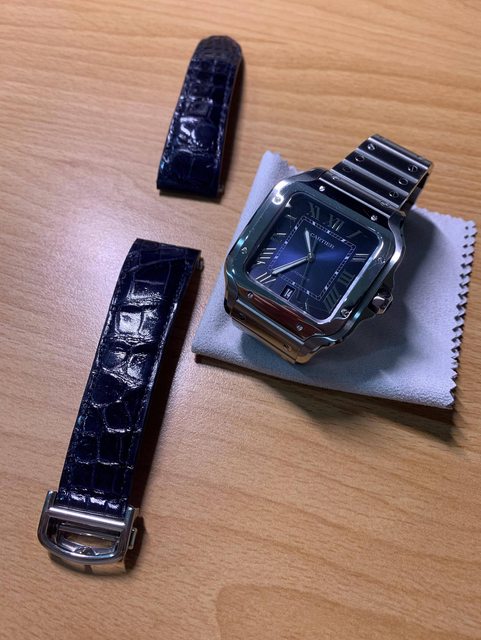 原廠皮錶帶只使用過一次,會再附上一條ted su特別訂製的快拆深藍短吻鱷魚皮錶帶(15,000),在訂製完後試戴使用過而已。