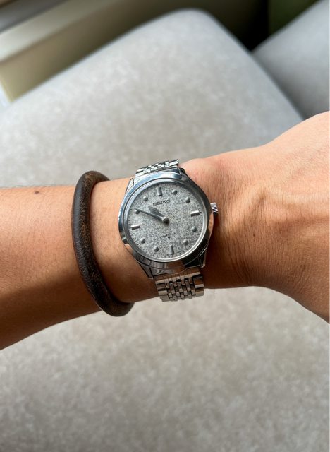 是正面可以開蓋,讓視障人士可用手觸摸指針及時標判斷時間,面盤沙礫面材質,可能是