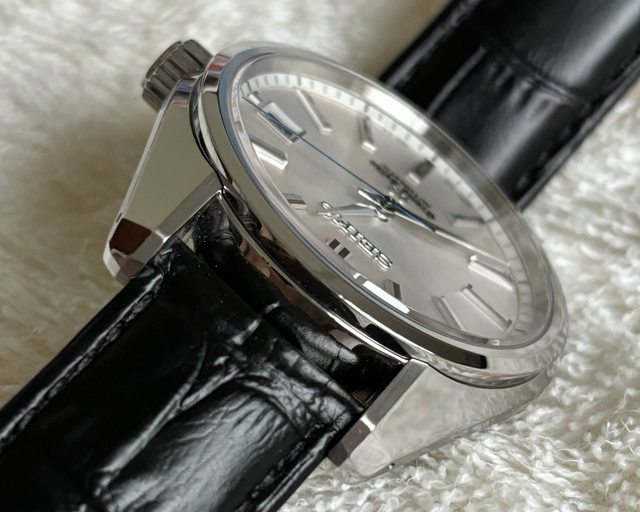此外,多切面的時標也是GS Seiko style的特色之一,在此銀白色的面盤上搭配的是全鏡